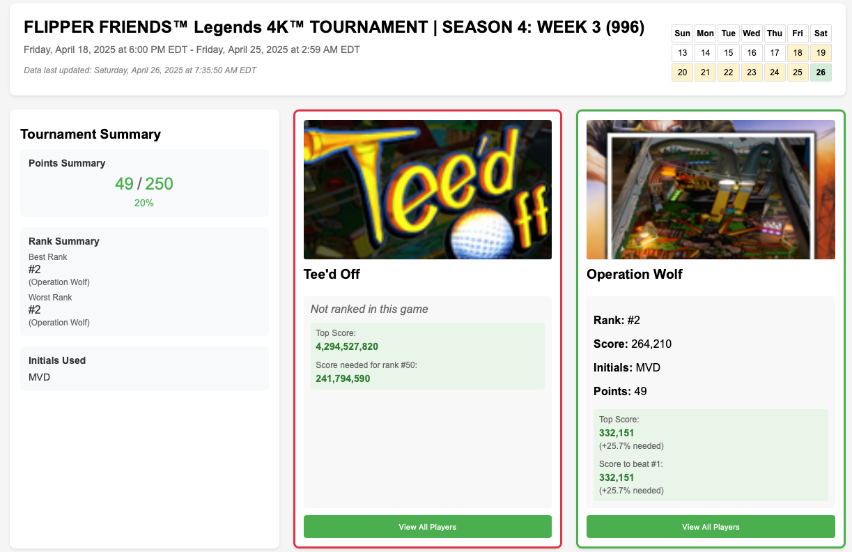 FliPal is a web application designed for pinball enthusiasts who participate in the Weekly AtGames Legends Pinball digital tournaments. It helps players track their scores, monitor their progress over time, and compare results with other participants.